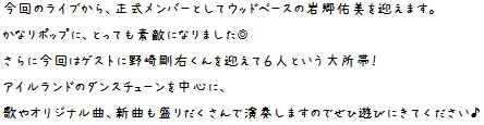 ‚«‚á‚ß‚é’èŠúLIVE 2015.11.24(‰Î) 19:30`22:00 (3 Stages) @—THE DUBLINERS' IRISH PUBiVh“Xj music charge “Š‚°‘K§ –‚«‚á‚ß‚é– ŽðˆäŠG”üiFiddle & Bouzoukij ûü—œÒŽqiWhistle & Concertinaj ¬“c—L‰À—¢iBodhran & Concertinaj ‰ªŠFŽÀiBouzoukij yTHE DUBLINERS' IRISH PUBz “Œ‹ž“sVh‹æVh3-28-9 Vhƒ‰ƒCƒIƒ“‰ïŠÙ2F TELF03-3352-6606 http://www.dubliners.jp/shinjuku/index.html @http://r.gnavi.co.jp/g209300/menu5/ |