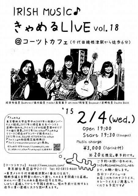 @‚QŒŽ‚S“úi…jnew!! @‚«‚á‚ß‚éLIVE vol.18 @—ƒR[ƒcƒgƒJƒtƒFiç‘ã“cüª’Éw‚©‚ç“k•à‚U•ªj @Open 19:00 / Start 19:30 (2 stages) @Charge 3,000‰~i1drink•tj @¦20–¼ŒÀ’èI—v—\–ñ‚Å‚· @–‚«‚á‚ß‚é– @ŽðˆäŠG”üiFiddlej @‚—œÒŽqiWhistlej @‰ªŠFŽÀiBouzoukij @¬“c—L‰À—¢iBodhranj @Šâ‹½—C”üiDoublebassj @ @yƒR[ƒcƒgƒJƒtƒFz @ ‘䓌‹æ’J’†2-1-11 @ Tel: 03-5815-4660 @@http://www.couzt.com/ |