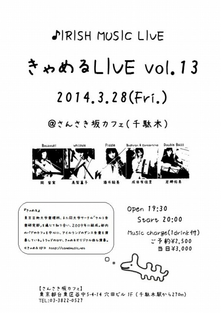 @‚«‚á‚ß‚éLIVE vol.13 @2014.3.28(‹à) open 19:30 start 20:00 @@—‚³‚ñ‚³‚«âƒJƒtƒFiç‘Ê–Øj @music charge i1drink•tj @‚²—\–ñ\2,500 “–“ú\3,000 @–‚«‚á‚ß‚é– @ŽðˆäŠG”üiFiddlej @‚—œÒŽqiWhistlej @‰ªŠFŽÀiBouzoukij @¬“c—L‰À—¢iBodhranj @Šâ‹½—C”ü(DoubleBass) @y‚³‚ñ‚³‚«âƒJƒtƒFz @§110-0001 “Œ‹ž“s‘䓌‹æ’J’†‚T’š–Ú‚S-‚P‚S @TEL:03-3822-0527 @http://sansakizaka.com/ @@@i’n}Eƒƒjƒ…[‚ÌŽQlƒy[ƒWj |