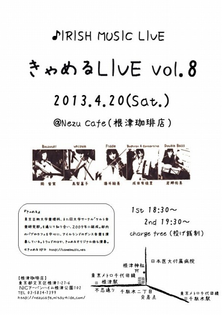 | @ | ‚«‚á‚ß‚éLIVEIvol.8 2013.4.20 “y@1st 18:30`, 2nd 19:30` @—Nezu Cafe iª’ÃàÛàè“Xj y‚«‚á‚ß‚éz ŽðˆäŠG”üiFiddlej ‚—œÒŽqiWhistlej ‰ªŠFŽÀiBouzoukij ¬“c—L‰À—¢iBodhranj Šâ‹½—C”ü(DoubleBass) yª’ÃàÛàè“Xz “Œ‹ž“s•¶‹ž‹æª’Ã1-27-6 ‚m‚h‚bƒA[ƒoƒ“ƒnƒCƒ€ª’ÃŒö‰€102 TEL 03-5834-7399 http://nezucafe.mitsu-hide.com/ |