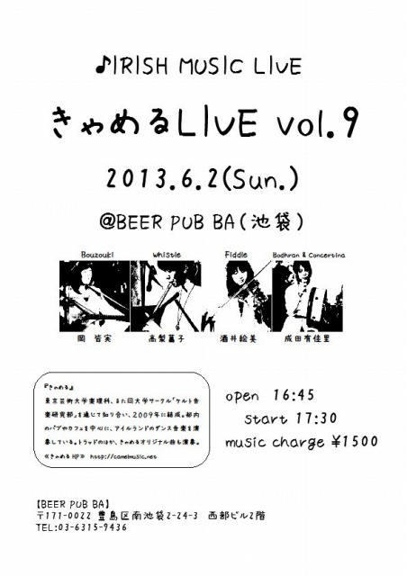 @‚«‚á‚ß‚é Live vol.9 @2013.6.2 “ú open 16:45 start 17:30 @@—BEER PUB BAi’r‘Üj @music charge 1500‰~i{1drink,1orderi600‰~`j) @–‚«‚á‚ß‚é– @ŽðˆäŠG”üiFiddlej @‚—œÒŽqiWhistlej @‰ªŠFŽÀiBouzoukij @¬“c—L‰À—¢iBodhranj @ôƒ_ƒuƒ‹ƒx[ƒX‚̊⋽—C”ü‚Í¡‰ñ‚Í‚¨‚â‚·‚݂ł·B @@‹v‚µ‚Ô‚è‚ÉŽll‚ʼn‰‘t‚µ‚Ü‚·I @yBEER PUB BAz @§171-0022 –L“‡‹æ“ì’r‘Ü2-24-3@¼•”ƒrƒ‹2ŠK @TEL:03-6315-9436 @https://www.facebook.com/BEERPUBBA |