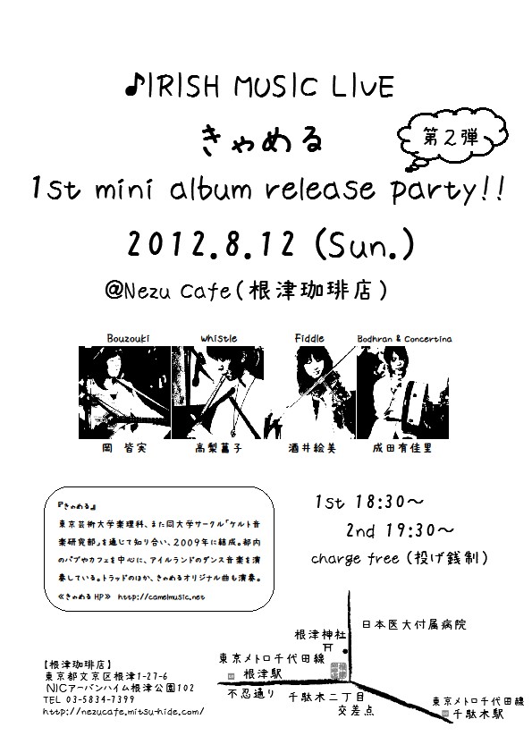 | @ | ‚«‚á‚ß‚é‚ÌH LIVE! 2012.10.28 “ú@1st 18:30`, 2nd 19:30` @—Nezu Cafe iª’ÃàÛàè“Xj y‚«‚á‚ß‚é z ŽðˆäŠG”üiFiddlej ‚—œÒŽqiWhistlej ‰ªŠFŽÀiBouzoukij ¬“c—L‰À—¢iBodhranj Šâ‹½—C”ü(DoubleBass) yª’ÃàÛàè“Xz “Œ‹ž“s•¶‹ž‹æª’Ã1-27-6 ‚m‚h‚bƒA[ƒoƒ“ƒnƒCƒ€ª’ÃŒö‰€102 TEL 03-5834-7399 http://nezucafe.mitsu-hide.com/ |
