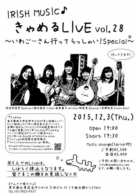 ‚«‚á‚ß‚éLIVE vol.28 @`‚¢‚킲[‚³‚ñs‚Á‚Ä‚ç‚Á‚µ‚á‚¢ISpecial` 2015.12.3(–Ø) open 19:00 start 19:30 @—‚³‚ñ‚³‚«âƒJƒtƒFiç‘Ê–Øj music charge i1drink•tj ‚²—\–ñ\2,500 “–“ú\3,000 –‚«‚á‚ß‚é– ŽðˆäŠG”üiFiddlej ‚—œÒŽqiWhistlej ‰ªŠFŽÀiBouzoukij ¬“c—L‰À—¢iBodhranj Šâ‹½—C”ü(DoubleBass) @@@¦‚Tl‚Å‚ÌLIVE‚Í‚µ‚΂炋xŽ~‚ƂȂè‚Ü‚·B @@@@@ŠF‚³‚Ü‚±‚Ì‹@‚ð‚Ç‚¤‚¼‚¨Œ©“¦‚µ‚È‚(^-^)/ @ y‚³‚ñ‚³‚«âƒJƒtƒFz §110-0001 “Œ‹ž“s‘䓌‹æ’J’†‚T’š–Ú‚S-‚P‚S TEL:03-3822-0527 @http://sansakizaka.com/ @@@i’n}Eƒƒjƒ…[‚ÌŽQlƒy[ƒWj |