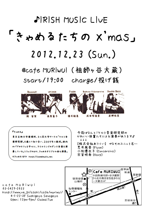 | @ | ‚«‚á‚߂邽‚¿‚ÆX'mas party!! 2012.12.23 “ú@19:00` @—Cafe MURIWUI i‘cŽtƒ–’J‘å‘ j y‚«‚á‚ß‚éz ŽðˆäŠG”üiFiddlej ‚—œÒŽqiWhistlej ‰ªŠFŽÀiBouzoukij ¬“c—L‰À—¢iBodhranj Šâ‹½—C”ü(DoubleBass) yДޮ‰ïŽÐ‚ ‚è‚‚¢z rˆä•— (Flute) ¬¼—DˆßŽq (Concertina) @‹{–¾Šó (Harp) |