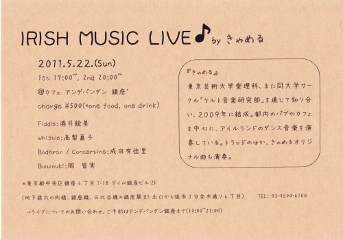 uƒAƒCƒŠƒbƒVƒ…E–k‰¢EƒP[ƒvƒuƒŒƒgƒ“ @@@@Trad Music@ƒ‰ƒCƒu•ƒZƒbƒVƒ‡ƒ“v @2012”N3ŒŽ24“ú(“y) @open: 18:00@start: 19:00 @@—…“¹‹´@Tapestry @“Œ‹ž“sç‘ã“c‹æŽOè’¬ 2-2-13 ”ªç‘ãƒrƒ‹‚QF @19F00`‚±‚ª‚炵 @19F30`“Œ‹žƒˆƒnƒ“ƒ\ƒ“ @20F15`‚«‚á‚ß‚é @21F00`Samurai Sompers @ƒ`ƒƒ[ƒW\1000iwith drink orderj |